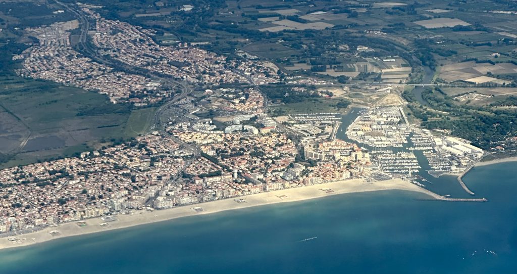 The town forms an inverted ‘L’ shape, as the etang – the large inland salt-water lake – and the protected wildlife zone prevent significant expansion to the south-west. To the east is the Mediterranean Sea, and to the north is the river Têt which forms the final town boundary.